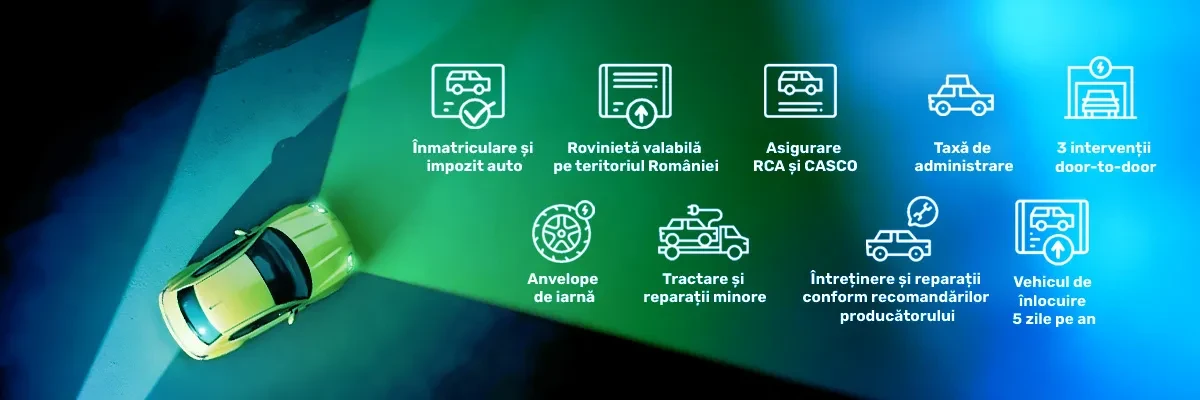 Plătești un tarif lunar care acoperă toate serviciile: întreținere, asigurare, asistență, livrare și multe altele.